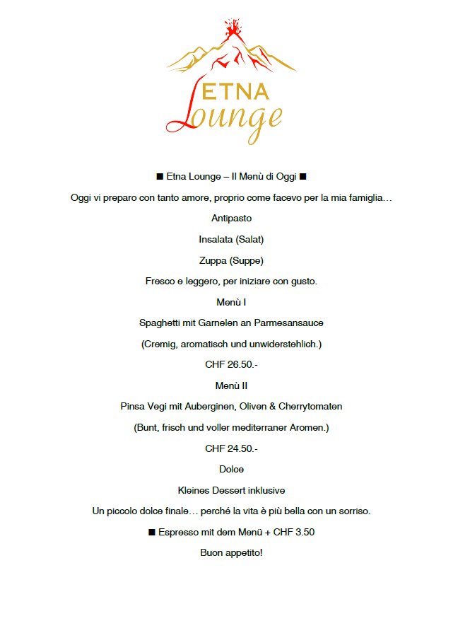 Die Etna Lounge ist ein Ort zum Geniessen, Entspannen und Zusammenkommen – geführt mit Herz und Leidenschaft von einem kleinen, engagierten Team: unserer talentierten Köchin, einem jungen spanischen Inhaber mit Vision und einer charmanten Serviererin, die jeden Gast mit einem Lächeln begrüsst.